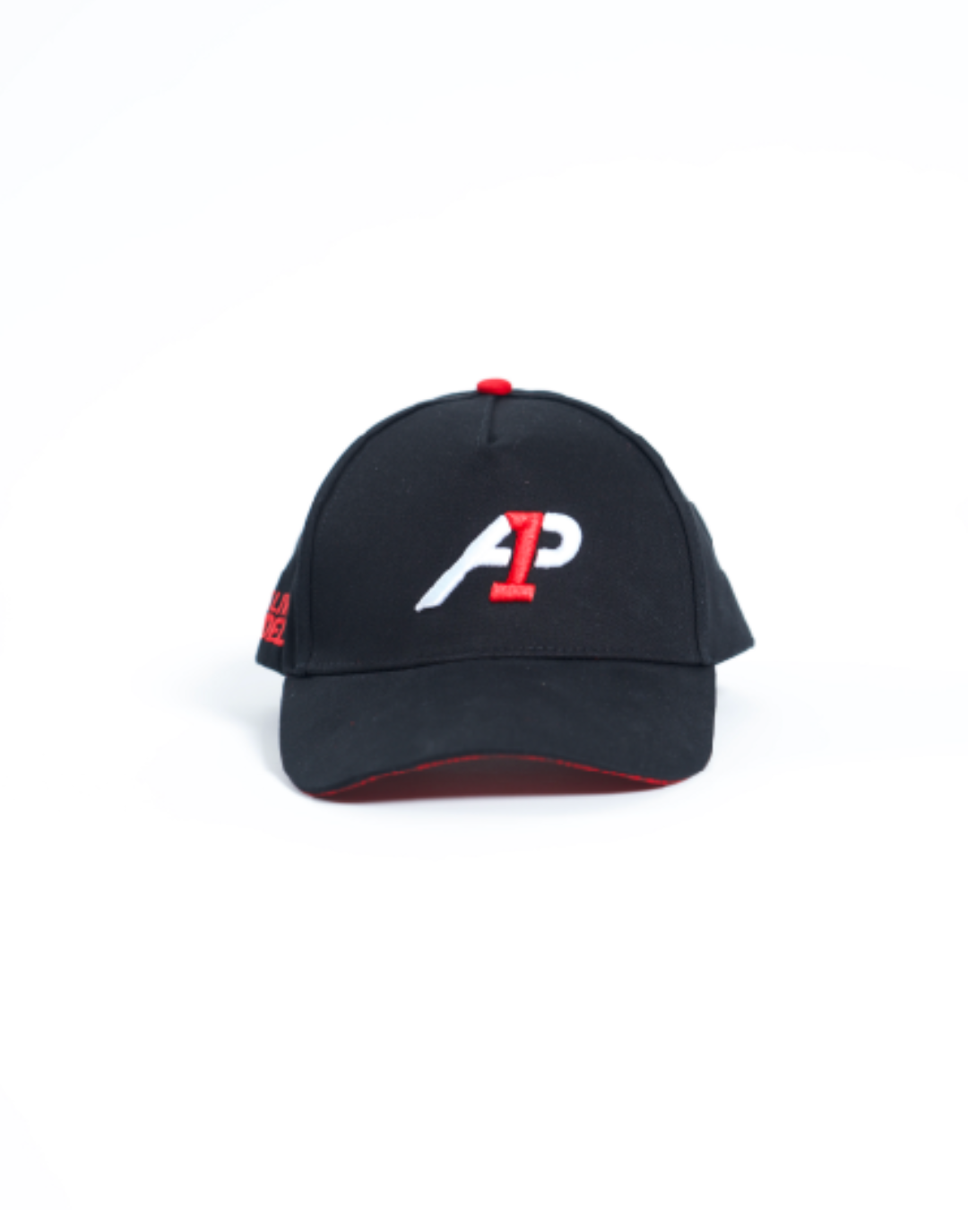 Diseño elegante en color negro con detalles en rojo y bordado de alta calidad.